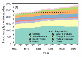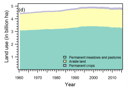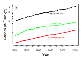 Het grootste gedeelte hiervan is grasland (groen: ‘permanent meadows and pastures’) dat nodig is voor koeien en andere herkauwers. Daar bovenop wordt een aanzienlijk deel van de voedselopbrengsten van akkerland (geel: ‘arabale land’), gebruikt om onze kippen, varkens en koeien mee te voeren. Dat wordt duidelijk in onderstaande grafiek (ook uit figuur 5.2 van het IPCC rapport): de zwarte lijn is de totale voedselopbrengst van het akkerland (denk aan granen, bonen, groenten). De groene lijn laat zien hoeveel daarvan wordt gebruikt als veevoer.