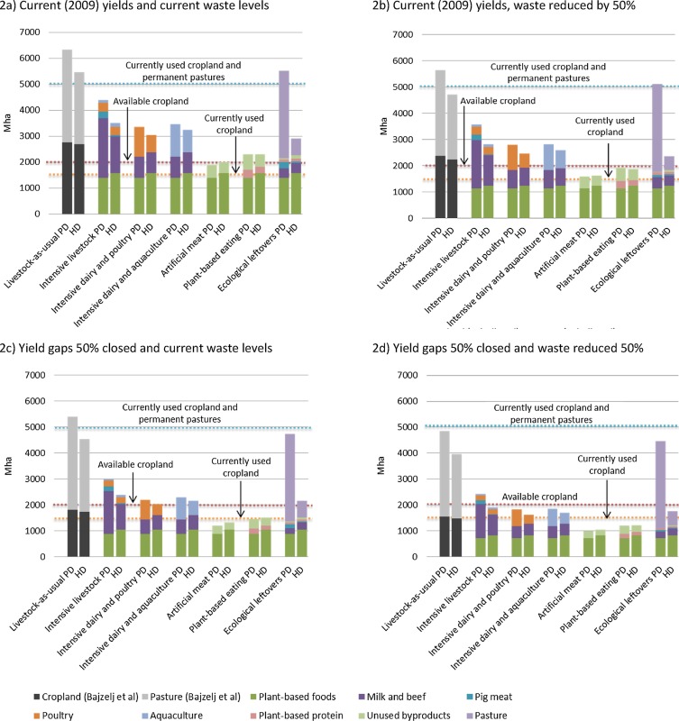 Zoals in de grafiek te zien verbruiken de scenario’s ‘Plant-based eating’ en (voor zover bekend) ‘Artificial meat’ het minste land. Ook wordt duidelijk dat er met een plantaardig eetpatroon voldoende akkerland is om de wereldbevolking in 2050 van voedsel te voorzien. Dat is ook een bevinding in hoofdstuk 5 van het IPCC-rapport over klimaat en landgebruik: “Under the most extreme scenario, where no animal products are consumed at all, adequate food production in 2050 could be achieved on less land than is currently used, allowing considerable forest regeneration.”