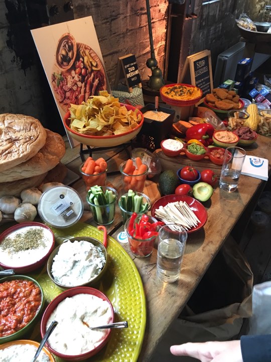 Van de koffie en chocoladefabriek gingen we door naar Amsterdam, waar op een knusse zolder in het Westerpark prachtig gevulde borreltafels stonden. Beetje jammer dat het voornamelijk heel veel vlees en kaas was, maar gelukkig kon ik ook een broodje hummus en paprika en lekkere noten scoren. Dus ik heb m'n buikje rondgegeten. De mensen moesten wel een beetje lachen toen ze mij zagen lopen met m'n sneetje volkorenbrood, een 'bammetje', terwijl zij daar stonden met sjieke borrelplankjes met kaas en worst. Er waren een aantal category managers van Albert Heijn aanwezig om al onze brandende vragen over de producten te beantwoorden. Bij het brood en de noten was het vooral een lofzang van mijn kant, wat een heerlijke producten en leuke mensen! Tja, volkorenbrood (het brood op de foto was bijvoorbeeld echt enorm lekker!) en noten, daar maak je bijna elke vegan blij mee. Bij de tafel met borrelhapjes- en spreads viel het me een beetje tegen: er waren allemaal spreads met zuivel. Gelukkig was er ook een bakje met hummus, die van het huismerk van Albert Heijn, die is erg lekker.