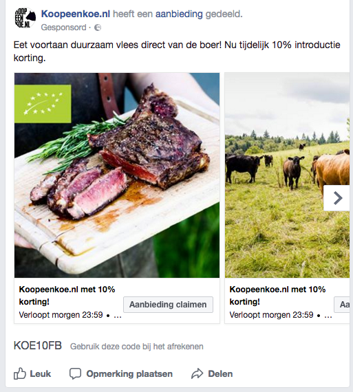 Op m'n Facebook verscheen op 24 oktober 2017 een reclame van koopeenkoe.nl met de tekst: “Eet voortaan duurzaam vlees direct van de boer. Nu tijdelijk 10% introductiekorting.”