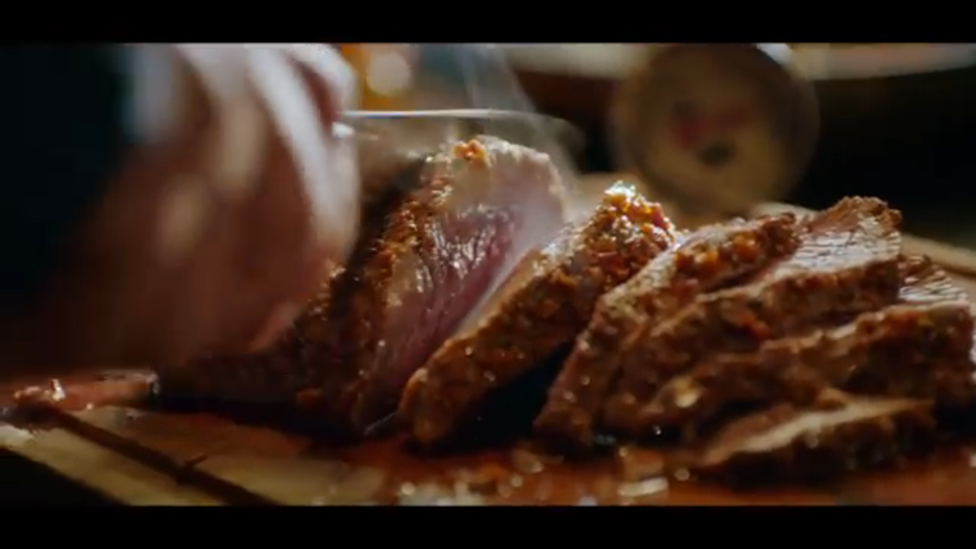 Terwijl het gezin begint met de kerstviering, neemt de commercial van Jumbo een duistere wending: we zien een schaaltje met gehaktballen en een enorme bonk vlees die wordt aangesneden.