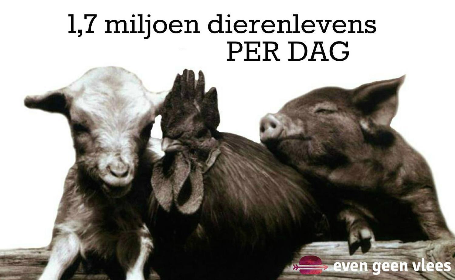 Naast dat Nederlanders veel dierlijke producten consumeren, zijn we een groot exportland van zuivel, eieren en vlees (bron: Rijksoverheid). In Nederland worden er jaarlijks zo'n 650 miljoen dieren geslacht (bron: Centraal Bureau voor de Statistiek). Dat komt dus neer op 1,8 miljoen dieren per dag, 1000 per minuut. En dit is exclusief vissen, die worden niet in aantallen, maar in kilo's bijgehouden. Daar is ook erg veel leed omdat er voor vissen geen wettelijke dodingsmethode is, ze stikken langzaam, worden geplet in de netten of ze worden levend gevild.